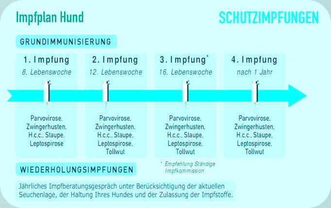 Infektionskrankheiten vorbeugenab 8 WochenImpfung gegen Staupe (S), Hepatitis (H), Parvovirose (P), Parainfluenza(Pi), Leptospirose (L)ab 12 WochenImpfung gegen Staupe (S), Hepatitis (H), Parvovirose (P), Parainfluenza(Pi), Leptospirose (L) und Tollwut (T)ab 16 Wochen(Stlko Vet. Impfempfehlungen)Impfung gegen Staupe (S), Hepatitis (H), Parvovirose (P), Parainfluenza(Pi), Leptospirose (L) und Tollwut (T)Bitte beachten Sie die jährliche Auffrischung!StaupeDie Hunde-Staupe ist bereits seit dem 18. Jahrhundert bekannt. Der Erreger der Hunde-Staupe ist ein Virus. In Deutschland ist die Staupe dank der regelmäßig bei Hunden durchgeführten Impfungen selten geworden.Doch vereinzelt treten immer wieder Erkrankungsfälle auf, meist bei ungeimpften Hunden. Die Ansteckung durch das Staupe-Virus erfolgt über Mund oder Nase des Hundes. Nach drei bis sechs Tagen kann dann Fieber auftreten. Später greift das Staupe-Virus verschiedene Organe im Körper des Hundes an. Dazu gehören der Verdauungs- und der Atmungsapparat, die Augen, die Haut und das Nervensystem.HepatitisDie ansteckende Leberentzündung tritt nur noch selten auf, weil die meisten Hunde regelmäßig durch eine Impfung geschützt werden. Das Virus wird nicht nur von Hund zu Hund durch Speichel, Harn oder Kot übertragen, sondern auch indirekt durch den Kontakt mit infizierten Gegenständen. Die Hunde können manchmal innerhalb weniger Stunden sterben, ohne dass der Tierhalter vorher etwas bemerkt hat. Symptome der Erkrankung sind Fieber, Mandelentzündung mit Lymphknotenschwellung, starke Bauchschmerzen, Lungenentzündung und Störung des zentralen Nervensystems. In der Heilungsphase können graue Hornhauttrübungen auftreten.LeptospiroseDie Erreger der Leptospirose, die Leptospiren (Bakterien), werden von befallenen Hunden oder anderen Tieren (zum Beispiel Ratten) mit dem Harn ausgeschieden und sind besonders in feuchtem Boden und in Gewässern sehr lange lebensfähig. Nicht nur Hunde und andere Tiere können sich anstecken, sondern auch der Mensch. Deshalb zählt man die Leptospirose zu den Zoonosen (Krankheiten und Infektionen, die natürlicherweise zwischen Wirbeltieren und Menschen übertragen werden).Die Leptospiren werden über die Schleimhäute des Verdauungsapparates aufgenommen und können sowohl leichte, fiebrige Erkrankungen als auch schwerste, bis zum Tode führende Leber- und Nierenschäden hervorrufen. Die regelmäßige Impfung schützt nicht nur den Hund selbst, sondern auch die Menschen, die mit ihm zusammenleben, vor einer durch den Hund übertragenen Leptospireninfektion.ParvoviroseUrsache und Übertragung:Die Parvovirose des Hundes wurde im Jahr 1978 fast gleichzeitig in Europa, Nordamerika und Australien entdeckt. Der Erreger, das Parvo-Virus, wird von erkrankten Tieren massenhaft mit dem Kot ausgeschieden und ist in der Außenwelt sehr lange lebensfähig. Typische Ansteckungsquellen sind mit Kot beschmutztes Futter, Gegenstände und Kleider. Das Parvo-Virus wird über den Mund aufgenommen und siedelt sich in der Dünndarmschleimhaut an.Krankheitsanzeichen:7 bis 14 Tage nach der Aufnahme des Virus können die ersten Krankheitsanzeichen auftreten. Die auffallendsten Symptome, wässrig bis blutiger, stinkender Durchfall und Erbrechen, sind die Folgen einer Zerstörung der Darmschleimhaut durch das Parvo-Virus. Die erkrankten Tiere trocknen schnell aus, viele müssen trotz intensivster tierärztlicher Bemühungen sterben.Vorbeugung:In den ersten Jahren hat man Hunde mit dem für Katzen bestimmten Katzenseuchen-Impfstoff geimpft. Das war möglich, weil der Erreger der Katzenseuche mit dem Parvo-Virus des Hundes verwandt ist. Daher kommt auch die frühere Bezeichnung „Katzenseuche des Hundes“ für die Parvovirose. Inzwischen gibt es spezielle Impfstoffe für den Hund. Rechtzeitige Impfungen bieten einen guten Schutz gegen die Infektion mit dem Parvo-Virus. Die Erkrankungshäufigkeit ist zwar nicht mehr so groß wie zu Beginn der 80er-Jahre, trotzdem infizieren sich immer noch viele Hunde. Durch einen Schnelltest kann das Parvo-Virus in einer Stuhlprobe sicher nachgewiesen werden.Wenn sich der Schlendrian im Zusammenhang mit der Parvovirose-Schutzimpfung breit macht, führt das häufig zu bösen Überraschungen. Bitte fragen Sie Ihre Tierärztin/Ihren Tierarzt, zu welchem Zeitpunkt die Impfungen erfolgen sollten, um optimalen Schutz zu gewähren.TollwutUrsache und Übertragung:Eine der gefährlichsten Krankheiten für Mensch und Tier ist die Tollwut. Dank der Impfung von Haustieren und Füchsen ist es gelungen, die bis heute unheilbare Tollwut stark einzudämmen. Sie kommt aber immer noch gelegentlich vor. Hunde und Katzen können durch den Kontakt mit Wildtieren, hauptsächlich mit Füchsen, angesteckt werden. Mit dem Speichel oder beim Biss wird das Virus übertragen.Krankheitsanzeichen:Früher kam es zu dem typischen Krankheitsverlauf bei den Hunden, die sich „wie toll“ benahmen. Heute sehen die Symptome häufig anders aus. Infizierte Tiere verhalten sich über eine längere Zeit fast normal, sind ruhig und unauffällig. Dieser äußere Eindruck täuscht. Tollwutinfizierte Tiere sind äußerst gefährlich und der Umgang mit ihnen ist auf jeden Fall zu vermeiden.Erst nach Wochen und Monaten nach der Ansteckung kann es zu klinischen Symptomen kommen, die mit Juckreiz, Speichelfluss, Unruhe und Beißwut auf Tollwut hinweisen können.Vorbeugung:Die einzige Maßnahme, die unseren Hund vor einer Tollwuterkrankung sicher schützt, ist die vorbeugende Impfung. Denken Sie bitte auf jeden Fall daran: Eine Auslandsreise ist ohne EU-Reisepass mit Impfnachweis gegen Tollwut nicht möglich.ZwingerhustenUrsache und Übertragung:Anders als der Name vielleicht fälschlich vermuten lässt, können nicht nur im Zwinger gehaltene, sondern auch in Wohnungen lebende Hunde an Zwingerhusten erkranken. Als Erreger des Zwingerhustens kommen gleich eine ganze Reihe verschiedener Viren und Bakterien in Frage.Die Ansteckung erfolgt über 